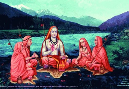 知恵によって生と死の苦しみを破壊する3つの世界の神であるSiva(シヴァ)の化身でこの宇宙そのものの純粋意識であり、無音のOmを意味する偉大な一番最初のguru(グル)、先生であるDakṣṇāmūṛti(ダクシナームールティ)が4人のṛṣi、聖者たちに教えました。彼は沈黙のままchin mudraという手の形でtat tvam asi、あなたがあれであるというvedāntaの真髄を教えました。親指はBrahmanで人差し指は純粋な意識であるātmā、つまり自分自身の本質で、それ以外の三本の指は身体、感覚、心を表し、自分の本質がBrahmanと離れていない真実を表すために親指と人差し指で輪を作っているのが象徴的な形です。