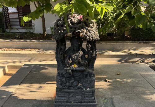 DakṣṇāmūṛtiとはDakṣṇāが南でmūṛtiが姿で、文字通り南を向く者という意味ですが、南は無知やsaṃsāra(サンサーラ)、輪廻と、mṛtyu(ムルッテュ)、死などを意味し、北は不滅やmokṣa(モークシャ)を意味します。Dakṣṇāmūṛtiは全てを超越しているため南を向き、教わるśiṣyaたちは北を向くことになります。